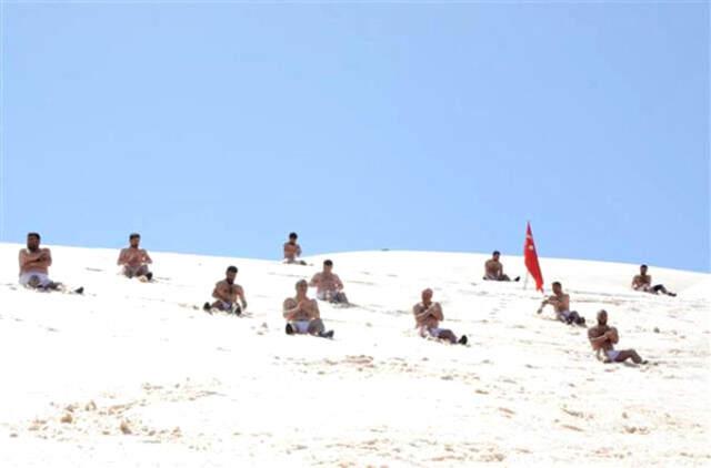 Yaklaşık 1.5 metreyi bulan kar üzerine yakınlarıyla birlikte uzanan Aydın, kızağa binerek Türkçe ve Kürtçe olarak türküyü söyledi.